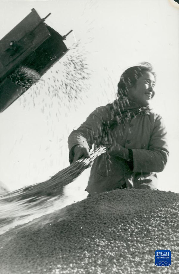 1970年,黑龍江墾區(qū)職工享受大豆豐收的喜悅(資料照片)。新華社發(fā)