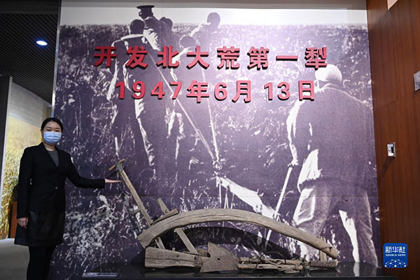 在北大荒博物館,工作人員介紹開(kāi)發(fā)北大荒第一犁的歷史(2021年3月10日攝)。新華社記者王建威攝