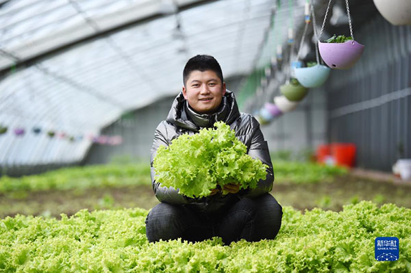 在黑龍江北大荒農(nóng)墾集團(tuán)雙峰農(nóng)場(chǎng)有限公司果蔬產(chǎn)業(yè)園區(qū)智控溫室,工作人員在展示剛采摘的生菜(2021年3月5日攝)。新華社記者 王建威 攝