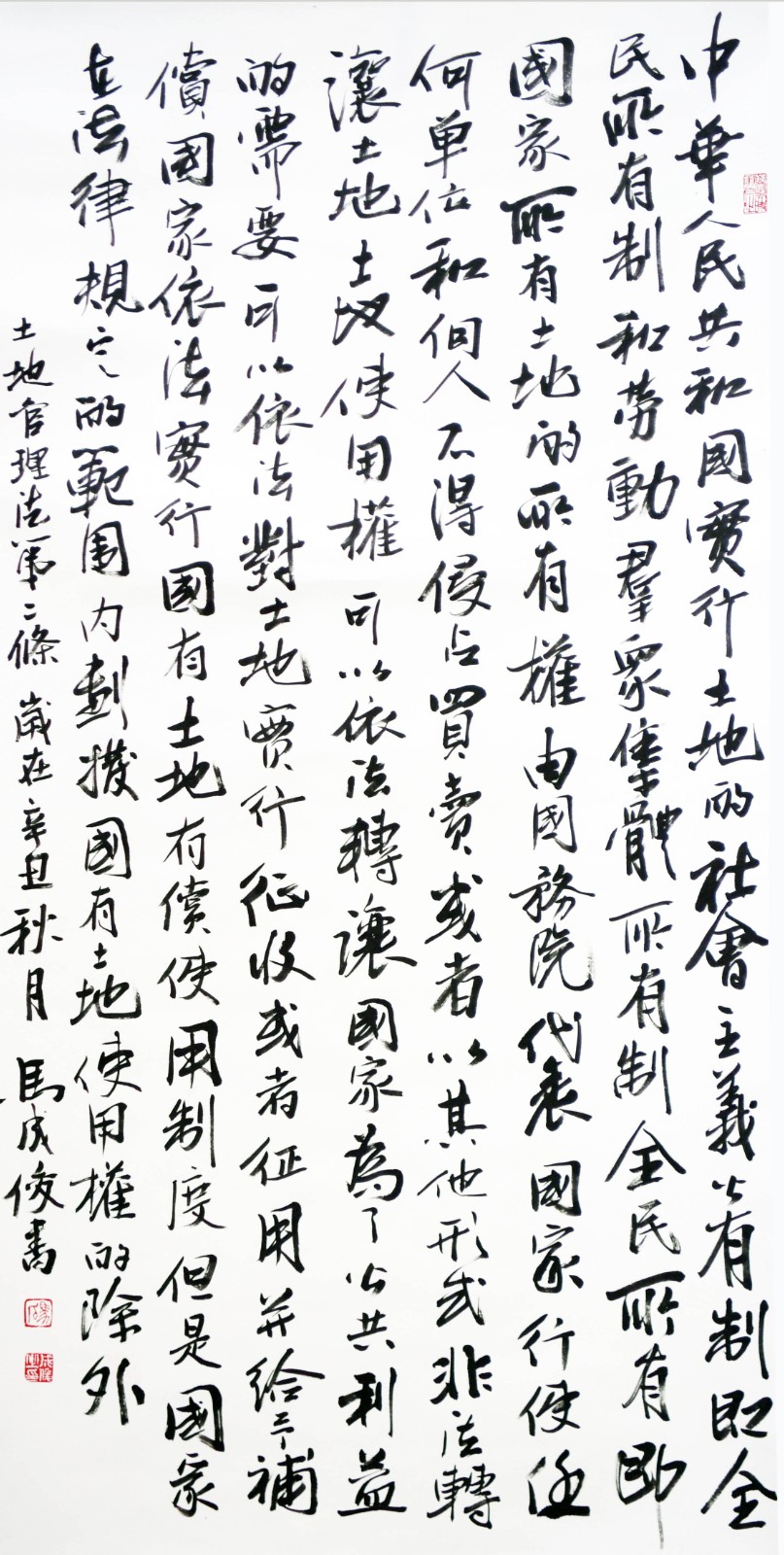 繼1600余位書法家參與書寫《中華人民共和國(guó)民法典》全部1260條法條之后,法治日?qǐng)?bào)社聯(lián)合自然資源部法規(guī)司、自然資源部書畫研究會(huì)和北京昌平書法家協(xié)會(huì),將筆端對(duì)準(zhǔn)土地管理“一法一條例”,即《中華人民共和國(guó)土地管理法》和《中華人民共和國(guó)土地管理法實(shí)施條例》。