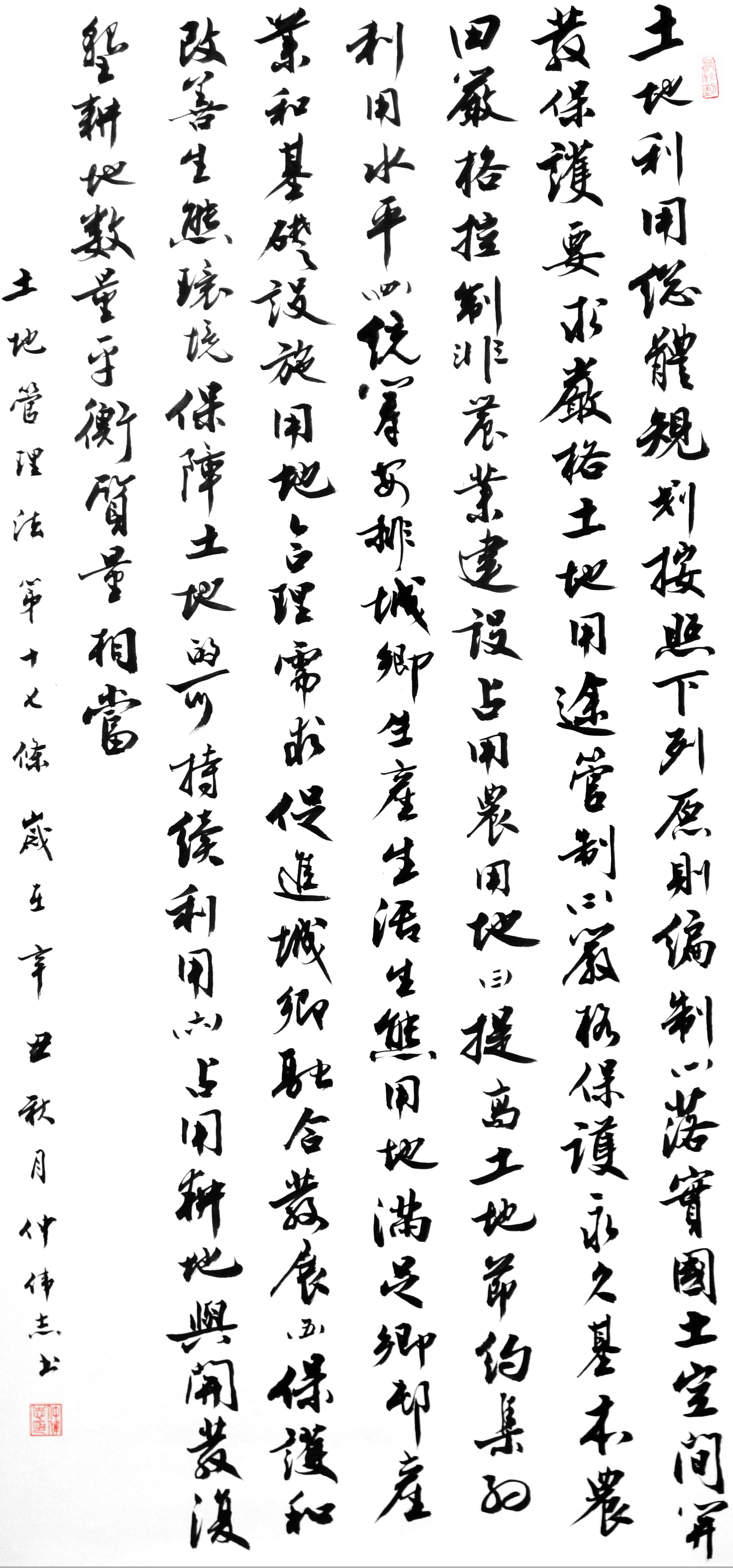 繼1600余位書法家參與書寫《中華人民共和國民法典》全部1260條法條之后,法治日報社聯(lián)合自然資源部法規(guī)司、自然資源部書畫研究會和北京昌平書法家協(xié)會,將筆端對準土地管理“一法一條例”,即《中華人民共和國土地管理法》和《中華人民共和國土地管理法實施條例》。