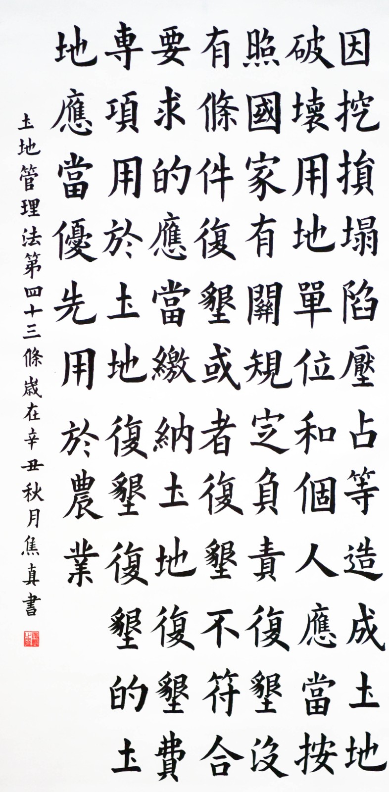 繼1600余位書法家參與書寫《中華人民共和國民法典》全部1260條法條之后,法治日報(bào)社聯(lián)合自然資源部法規(guī)司、自然資源部書畫研究會和北京昌平書法家協(xié)會,將筆端對準(zhǔn)土地管理“一法一條例”,即《中華人民共和國土地管理法》和《中華人民共和國土地管理法實(shí)施條例》。