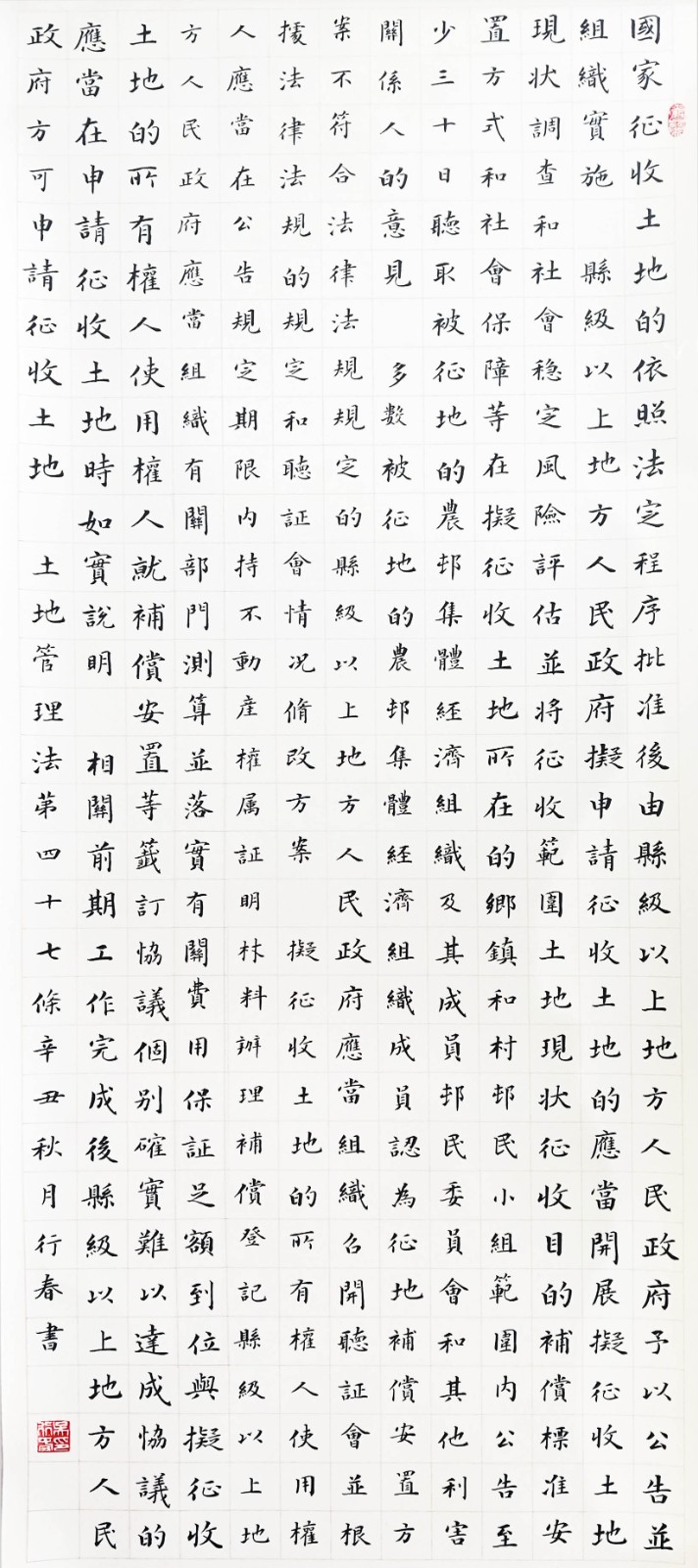 繼1600余位書法家參與書寫《中華人民共和國民法典》全部1260條法條之后,法治日報社聯(lián)合自然資源部法規(guī)司、自然資源部書畫研究會和北京昌平書法家協(xié)會,將筆端對準土地管理“一法一條例”,即《中華人民共和國土地管理法》和《中華人民共和國土地管理法實施條例》。