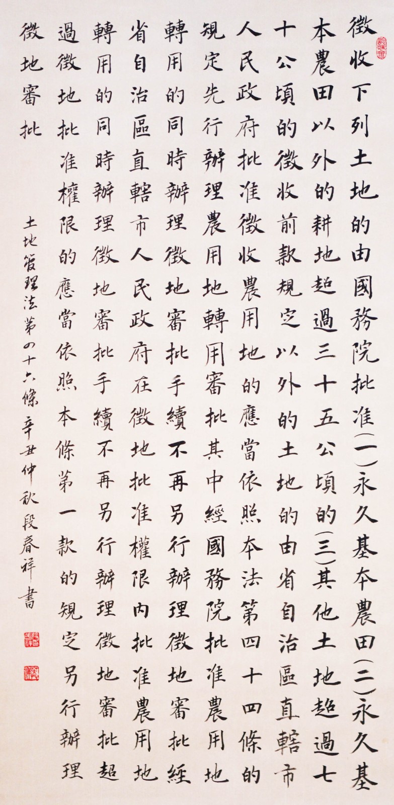 繼1600余位書法家參與書寫《中華人民共和國民法典》全部1260條法條之后,法治日報社聯(lián)合自然資源部法規(guī)司、自然資源部書畫研究會和北京昌平書法家協(xié)會,將筆端對準(zhǔn)土地管理“一法一條例”,即《中華人民共和國土地管理法》和《中華人民共和國土地管理法實施條例》。