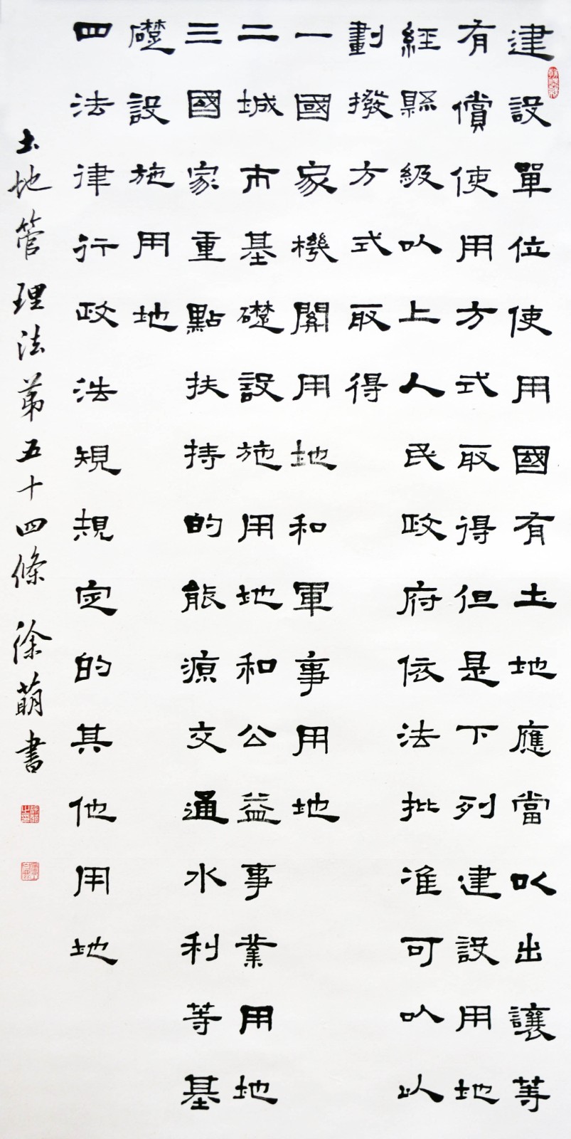 繼1600余位書法家參與書寫《中華人民共和國民法典》全部1260條法條之后,法治日?qǐng)?bào)社聯(lián)合自然資源部法規(guī)司、自然資源部書畫研究會(huì)和北京昌平書法家協(xié)會(huì),將筆端對(duì)準(zhǔn)土地管理“一法一條例”,即《中華人民共和國土地管理法》和《中華人民共和國土地管理法實(shí)施條例》。
