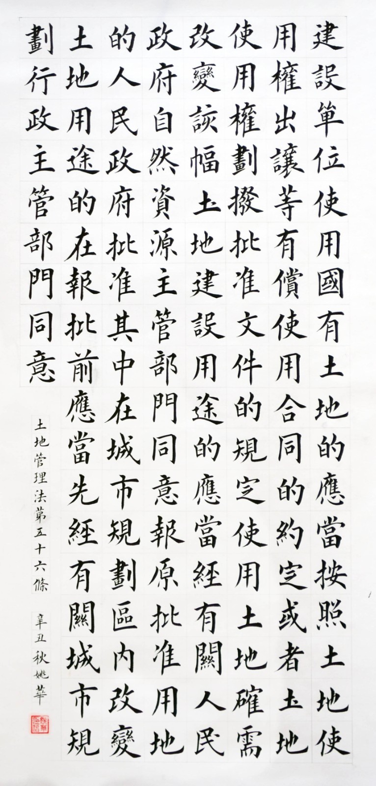 繼1600余位書法家參與書寫《中華人民共和國民法典》全部1260條法條之后,法治日報社聯(lián)合自然資源部法規(guī)司、自然資源部書畫研究會和北京昌平書法家協(xié)會,將筆端對準(zhǔn)土地管理“一法一條例”,即《中華人民共和國土地管理法》和《中華人民共和國土地管理法實施條例》。