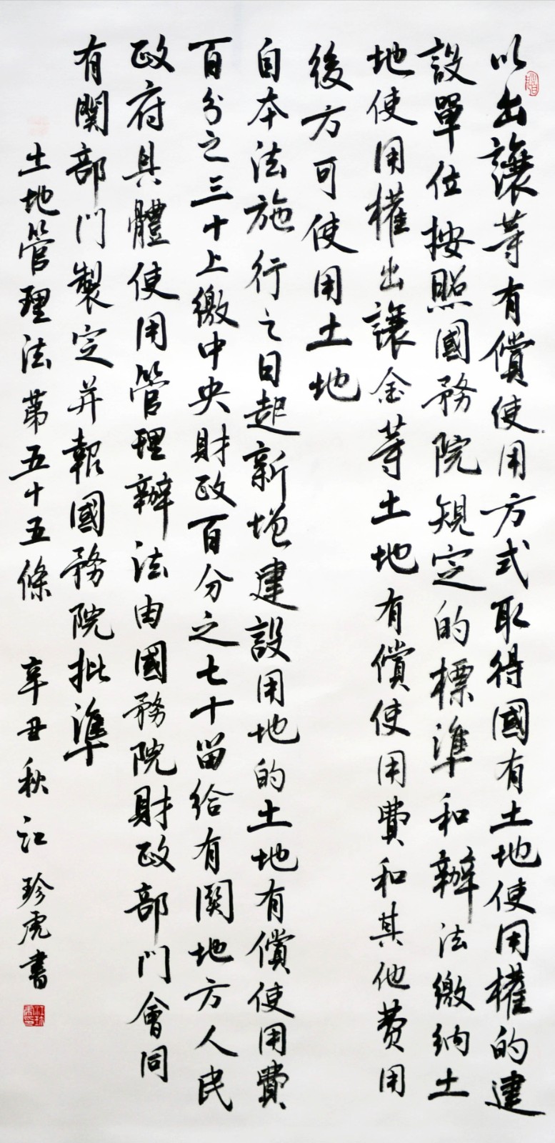 繼1600余位書法家參與書寫《中華人民共和國民法典》全部1260條法條之后,法治日報社聯(lián)合自然資源部法規(guī)司、自然資源部書畫研究會和北京昌平書法家協(xié)會,將筆端對準土地管理“一法一條例”,即《中華人民共和國土地管理法》和《中華人民共和國土地管理法實施條例》。