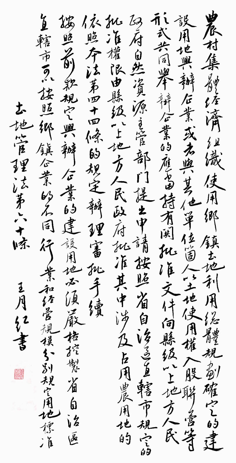繼1600余位書法家參與書寫《中華人民共和國民法典》全部1260條法條之后,法治日報社聯(lián)合自然資源部法規(guī)司、自然資源部書畫研究會和北京昌平書法家協(xié)會,將筆端對準土地管理“一法一條例”,即《中華人民共和國土地管理法》和《中華人民共和國土地管理法實施條例》。