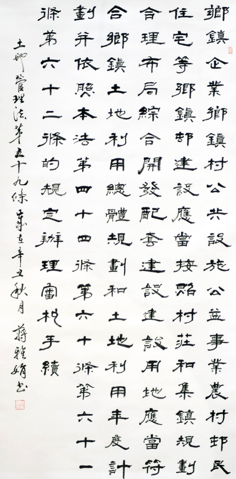 繼1600余位書法家參與書寫《中華人民共和國民法典》全部1260條法條之后,法治日報(bào)社聯(lián)合自然資源部法規(guī)司、自然資源部書畫研究會(huì)和北京昌平書法家協(xié)會(huì),將筆端對(duì)準(zhǔn)土地管理“一法一條例”,即《中華人民共和國土地管理法》和《中華人民共和國土地管理法實(shí)施條例》。