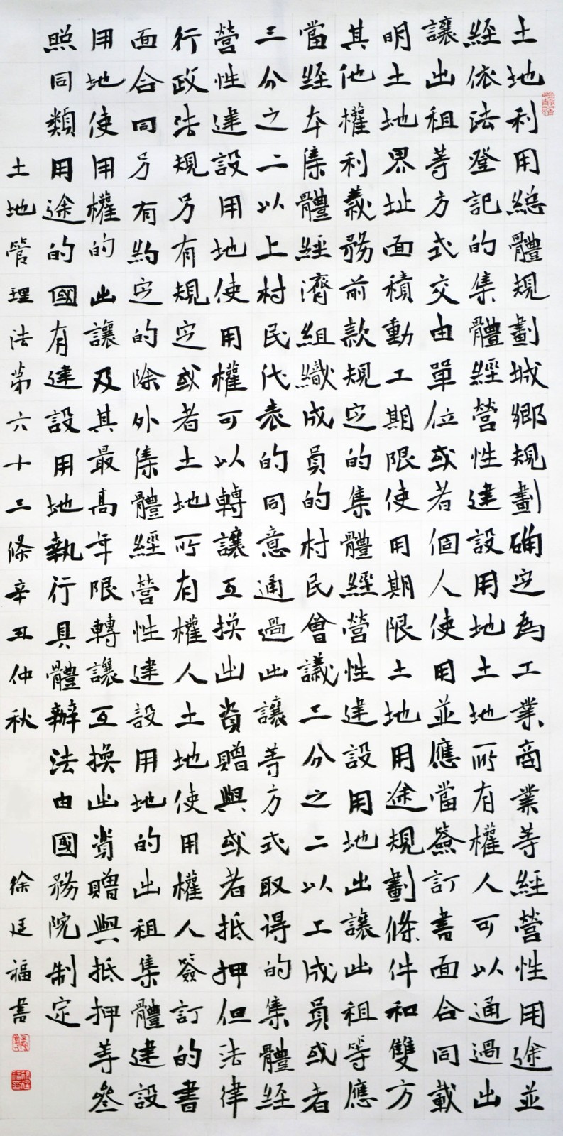 繼1600余位書法家參與書寫《中華人民共和國民法典》全部1260條法條之后,法治日報社聯(lián)合自然資源部法規(guī)司、自然資源部書畫研究會和北京昌平書法家協(xié)會,將筆端對準(zhǔn)土地管理“一法一條例”,即《中華人民共和國土地管理法》和《中華人民共和國土地管理法實施條例》。