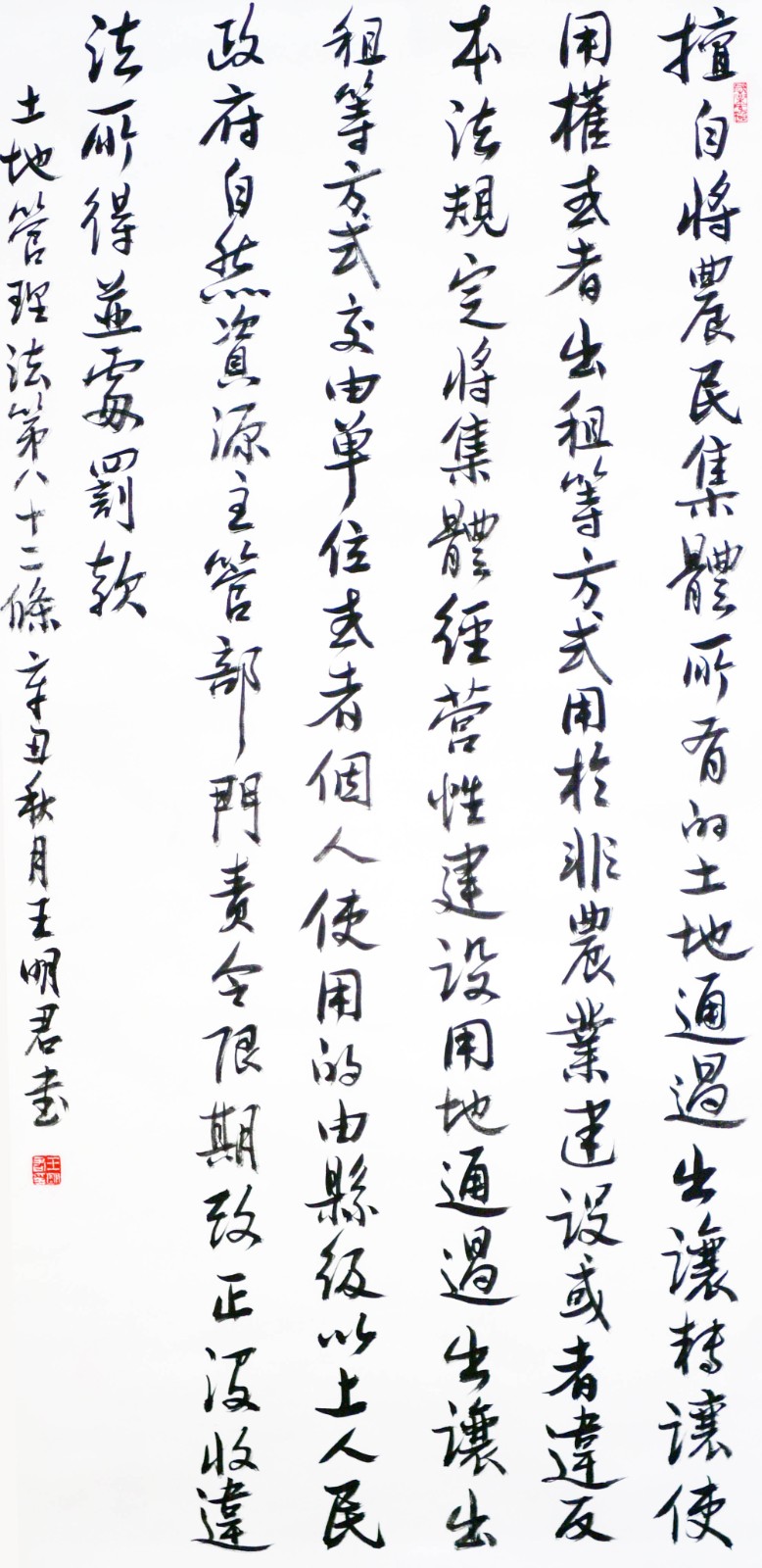 繼1600余位書法家參與書寫《中華人民共和國民法典》全部1260條法條之后,法治日報(bào)社聯(lián)合自然資源部法規(guī)司、自然資源部書畫研究會和北京昌平書法家協(xié)會,將筆端對準(zhǔn)土地管理“一法一條例”,即《中華人民共和國土地管理法》和《中華人民共和國土地管理法實(shí)施條例》。