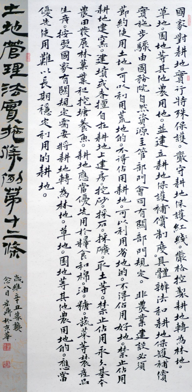 繼1600余位書法家參與書寫《中華人民共和國民法典》全部1260條法條之后,法治日報社聯(lián)合自然資源部法規(guī)司、自然資源部書畫研究會和北京昌平書法家協(xié)會,將筆端對準土地管理“一法一條例”,即《中華人民共和國土地管理法》和《中華人民共和國土地管理法實施條例》。