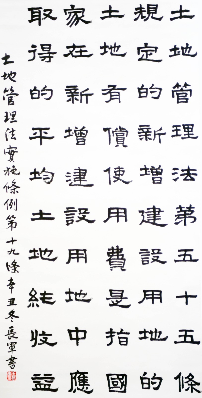 繼1600余位書法家參與書寫《中華人民共和國民法典》全部1260條法條之后,法治日報社聯(lián)合自然資源部法規(guī)司、自然資源部書畫研究會和北京昌平書法家協(xié)會,將筆端對準土地管理“一法一條例”,即《中華人民共和國土地管理法》和《中華人民共和國土地管理法實施條例》。