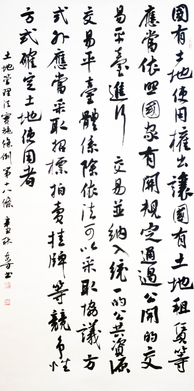 繼1600余位書法家參與書寫《中華人民共和國(guó)民法典》全部1260條法條之后,法治日?qǐng)?bào)社聯(lián)合自然資源部法規(guī)司、自然資源部書畫研究會(huì)和北京昌平書法家協(xié)會(huì),將筆端對(duì)準(zhǔn)土地管理“一法一條例”,即《中華人民共和國(guó)土地管理法》和《中華人民共和國(guó)土地管理法實(shí)施條例》。
