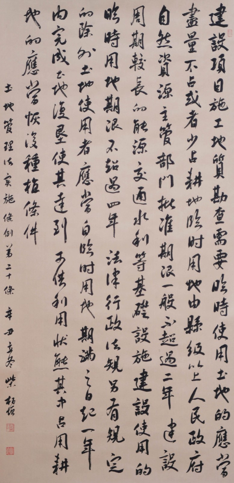 繼1600余位書法家參與書寫《中華人民共和國民法典》全部1260條法條之后,法治日報社聯(lián)合自然資源部法規(guī)司、自然資源部書畫研究會和北京昌平書法家協(xié)會,將筆端對準(zhǔn)土地管理“一法一條例”,即《中華人民共和國土地管理法》和《中華人民共和國土地管理法實施條例》。