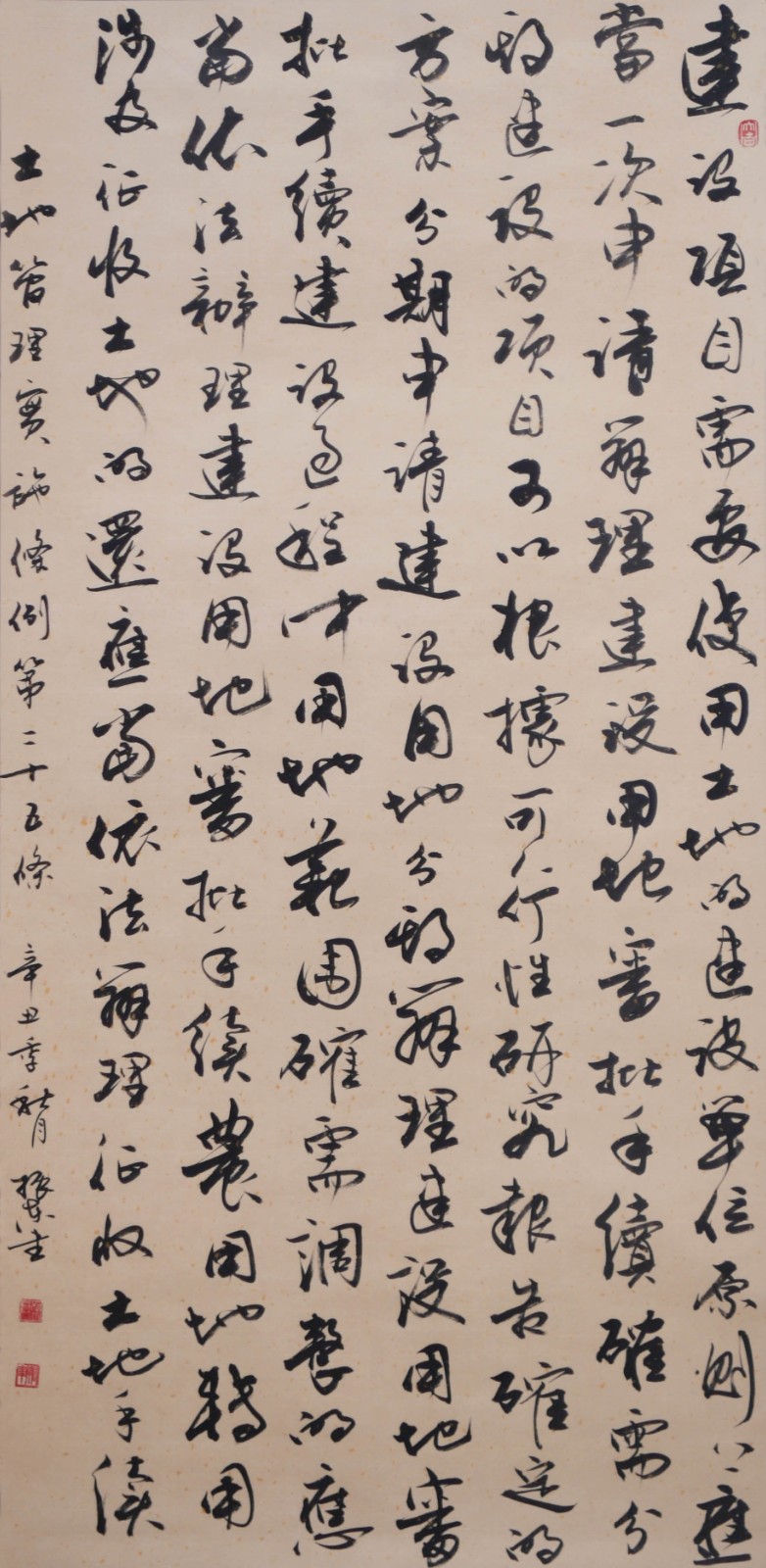 繼1600余位書法家參與書寫《中華人民共和國民法典》全部1260條法條之后,法治日報(bào)社聯(lián)合自然資源部法規(guī)司、自然資源部書畫研究會和北京昌平書法家協(xié)會,將筆端對準(zhǔn)土地管理“一法一條例”,即《中華人民共和國土地管理法》和《中華人民共和國土地管理法實(shí)施條例》。