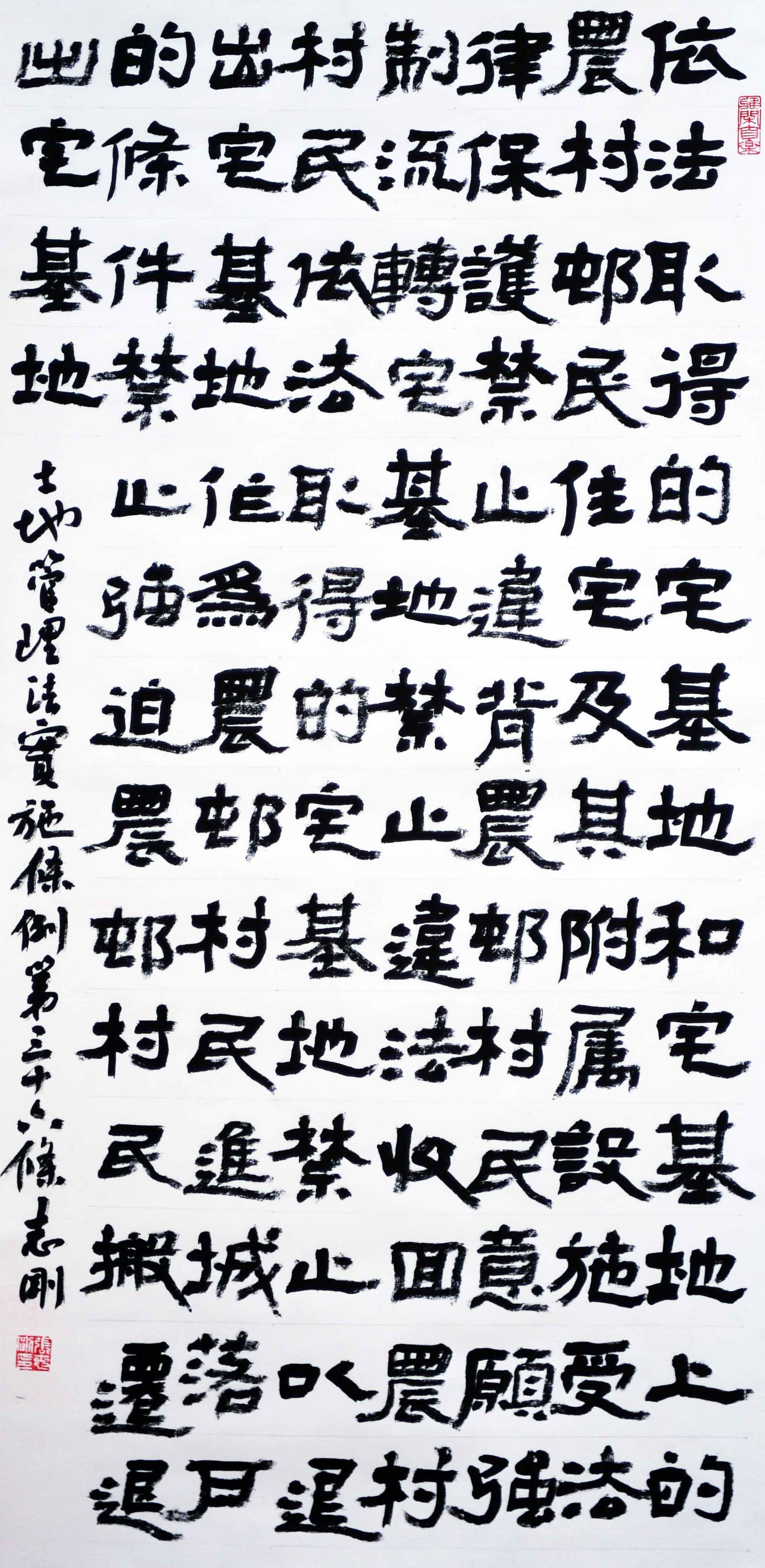 繼1600余位書法家參與書寫《中華人民共和國民法典》全部1260條法條之后,法治日?qǐng)?bào)社聯(lián)合自然資源部法規(guī)司、自然資源部書畫研究會(huì)和北京昌平書法家協(xié)會(huì),將筆端對(duì)準(zhǔn)土地管理“一法一條例”,即《中華人民共和國土地管理法》和《中華人民共和國土地管理法實(shí)施條例》。