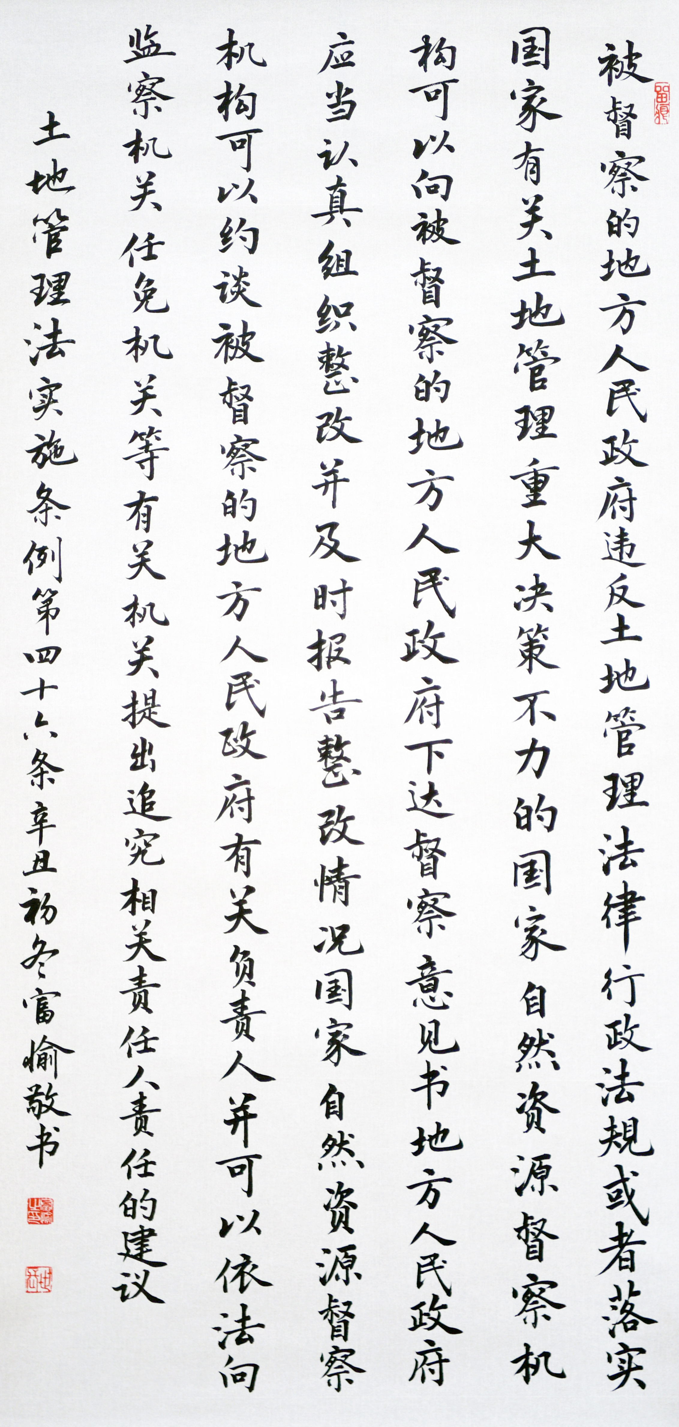 繼1600余位書法家參與書寫《中華人民共和國民法典》全部1260條法條之后,法治日報社聯(lián)合自然資源部法規(guī)司、自然資源部書畫研究會和北京昌平書法家協(xié)會,將筆端對準土地管理“一法一條例”,即《中華人民共和國土地管理法》和《中華人民共和國土地管理法實施條例》。