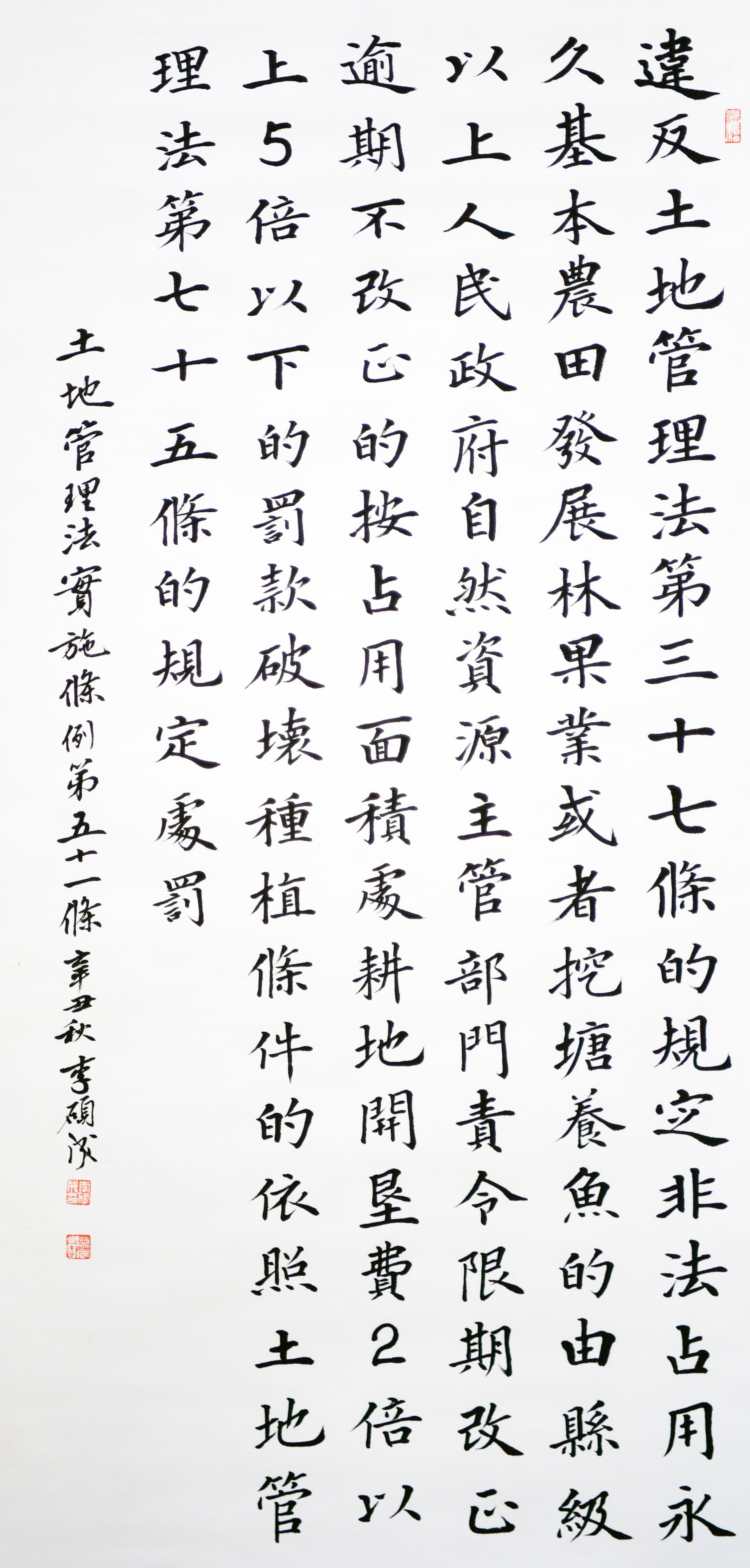 繼1600余位書法家參與書寫《中華人民共和國民法典》全部1260條法條之后,法治日?qǐng)?bào)社聯(lián)合自然資源部法規(guī)司、自然資源部書畫研究會(huì)和北京昌平書法家協(xié)會(huì),將筆端對(duì)準(zhǔn)土地管理“一法一條例”,即《中華人民共和國土地管理法》和《中華人民共和國土地管理法實(shí)施條例》。