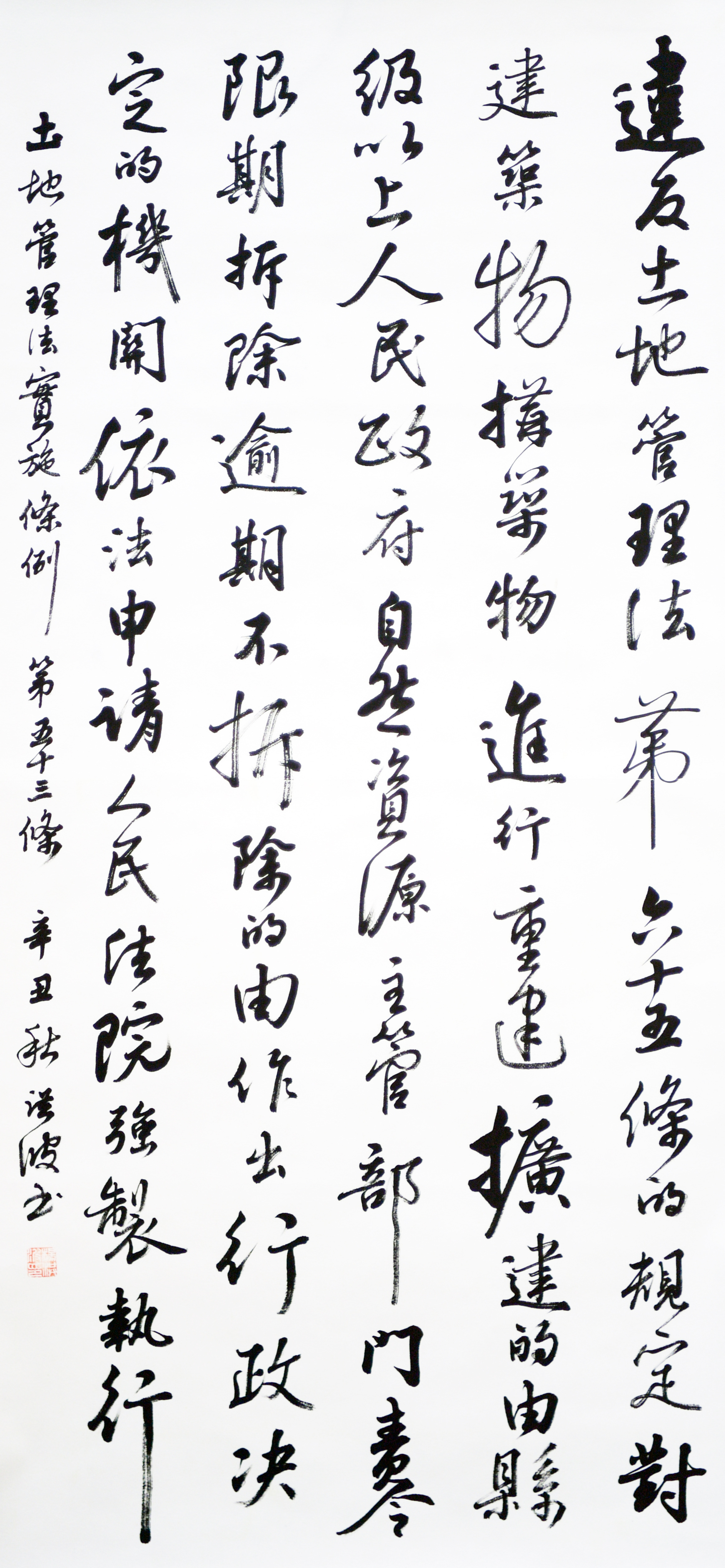 繼1600余位書法家參與書寫《中華人民共和國民法典》全部1260條法條之后,法治日報社聯(lián)合自然資源部法規(guī)司、自然資源部書畫研究會和北京昌平書法家協(xié)會,將筆端對準(zhǔn)土地管理“一法一條例”,即《中華人民共和國土地管理法》和《中華人民共和國土地管理法實施條例》。