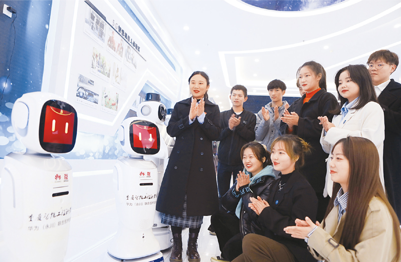 2021年11月13日,重慶智能工程職業(yè)學(xué)院校園內(nèi),智能機(jī)器人“大華”、“大智”向?qū)W生們普及黨的十九屆六中全會(huì)精神,其可愛(ài)的形象和聲音,深受學(xué)生們的喜愛(ài)。 人民圖片 陳仕川/攝