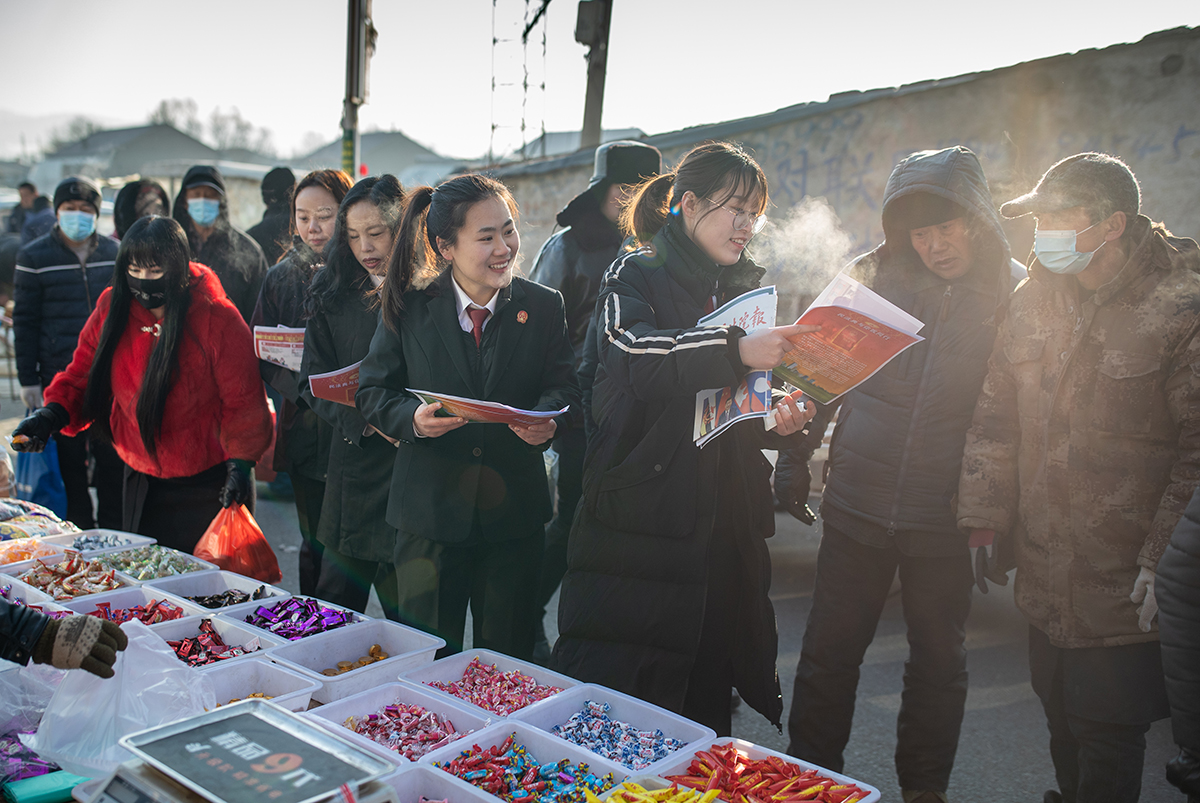 1月28日,吉林省四平市鐵東區(qū)葉赫滿族鎮(zhèn)年前最后一個大集,四平市中級人民法院工作人員向群眾發(fā)放民法典宣傳單。
