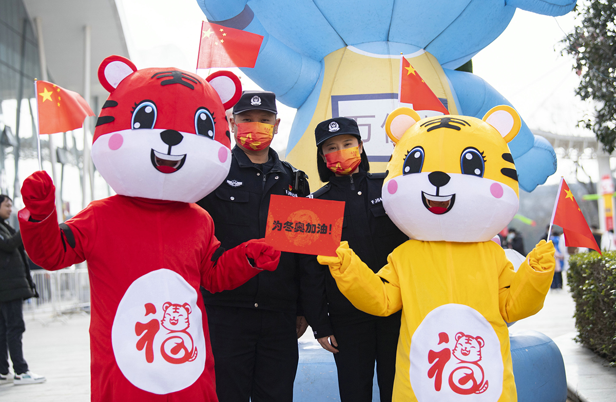2月4日,立春時節(jié),農(nóng)歷大年初四,安徽省舒城縣公安局萬佛湖旅游度假區(qū)派出所執(zhí)勤民警輔警與景區(qū)“萌虎”一起,為冬奧加油。