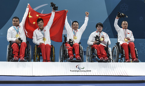 2018年3月17日,中國(guó)隊(duì)在平昌冬殘奧會(huì)輪椅冰壺比賽中獲得金牌。圖為隊(duì)員王海濤、陳建新、劉微、王蒙、張強(qiáng)(從左至右)在頒獎(jiǎng)儀式上。新華社記者夏一方攝