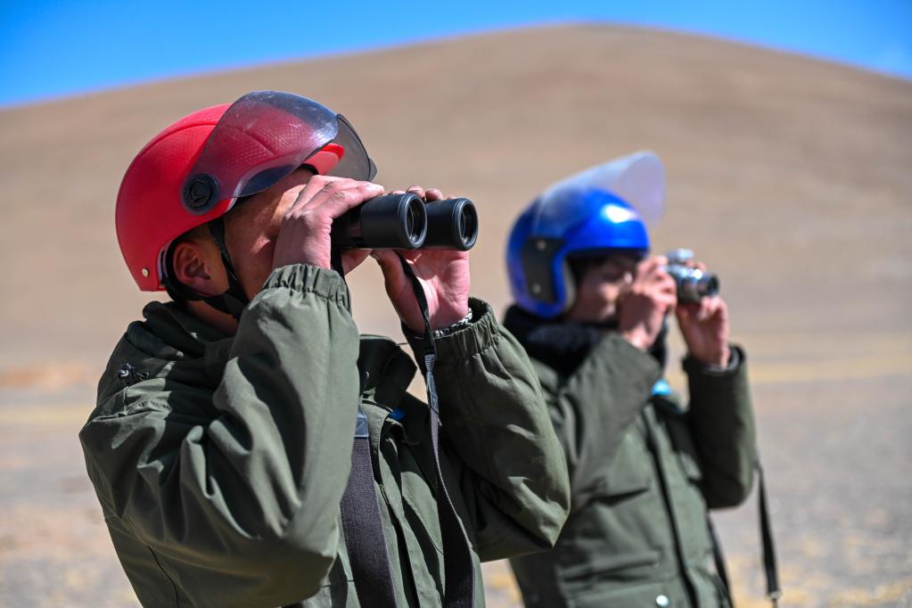 洛桑日達(dá)(左)與隊(duì)友正在觀察野生動(dòng)物。新華社記者周荻瀟 攝