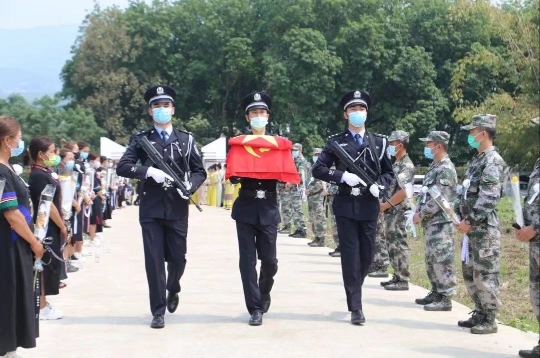 3月30日,蔡曉東烈士被安葬在云南省西雙版納景洪市勐龍烈士陵園,長眠在他用生命守護的邊境線旁。圖為安葬儀式現場。 云南出入境邊防檢查總站供圖