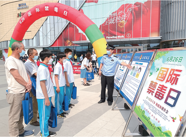 在“6·26”國(guó)際禁毒日即將來臨之際,6月11日,山東省膠州市委政法委、市人民法院、市人民檢察院、市教育和體育局、市公安局、市婦女聯(lián)合會(huì)、市公證處、市法學(xué)會(huì)等部門在膠州市龍湖天街廣場(chǎng)聯(lián)合開展禁毒宣傳活動(dòng),進(jìn)一步推進(jìn)禁毒宣傳,營(yíng)造“社會(huì)群眾齊齊參與,禁毒知識(shí)人人知曉”的全民禁毒良好氛圍。圖為膠州市公安局禁毒大隊(duì)民警向群眾講解禁毒知識(shí)。