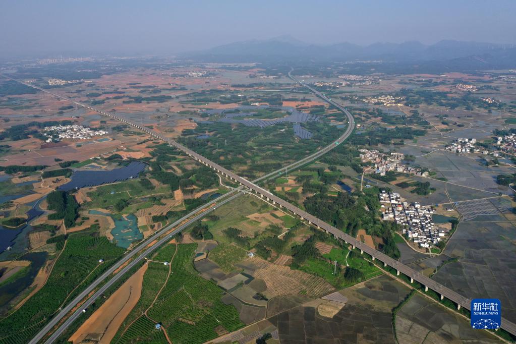 南廣高鐵和蒼碩高速在廣西賓陽縣古辣鎮(zhèn)交匯(2022年4月4日攝,無人機照片)。新華社記者 黃孝邦 攝