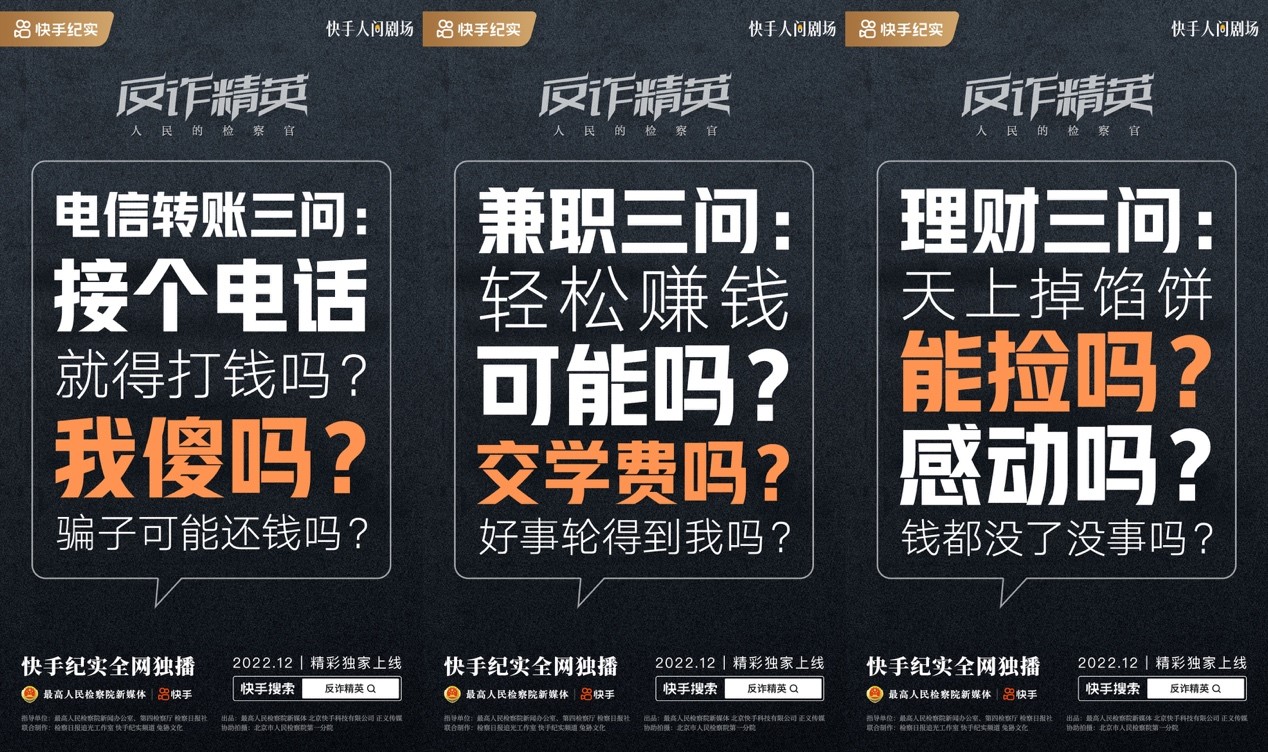 單親媽媽為何深陷“殺豬盤”執(zhí)迷不悟?什么樣的項(xiàng)目專騙老年人還屢屢得手?詐騙分子如何一人分飾多角?現(xiàn)實(shí)中,電信網(wǎng)絡(luò)詐騙犯罪愈演愈烈,亟需人們提高警惕。近日,反電信網(wǎng)絡(luò)詐騙法正式施行。由最高人民檢察院新聞辦公室、第四檢察廳及檢察日?qǐng)?bào)社指導(dǎo),最高人民檢察院新媒體、快手及正義傳媒聯(lián)合出品的反詐主題紀(jì)實(shí)短劇《反詐精英——人民的檢察官》(以下簡(jiǎn)稱“《反詐精英》”)于2022年12月10日在快手獨(dú)家上線,@最高人民檢察院 @正義網(wǎng) 兩大快手賬號(hào)首發(fā)。《反詐精英》從奮戰(zhàn)在辦案一線的人民檢察官視角出發(fā),以富有戲劇張力的紀(jì)實(shí)短劇形式講述真實(shí)反詐故事,創(chuàng)新呈現(xiàn)專業(yè)普法內(nèi)容。