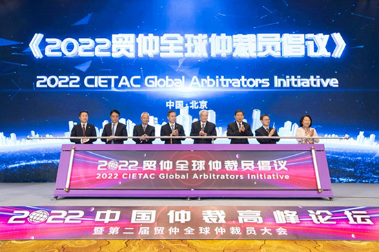 (任鴻斌會長、王勝明副主任、熊選國副部長、劉貴祥專委、柯良棟副會長、費宗祎榮譽仲裁員、鄭若驊仲裁員、王承杰秘書長共同支持發(fā)布《2022貿仲全球仲裁員倡議》)