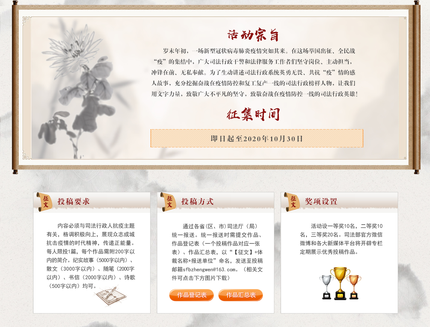 近日,司法部“致敬戰(zhàn)疫英雄”征文活動(dòng)評(píng)選結(jié)果正式揭曉。經(jīng)過初評(píng)、復(fù)評(píng),評(píng)選出一等獎(jiǎng)10件...[詳細(xì)]